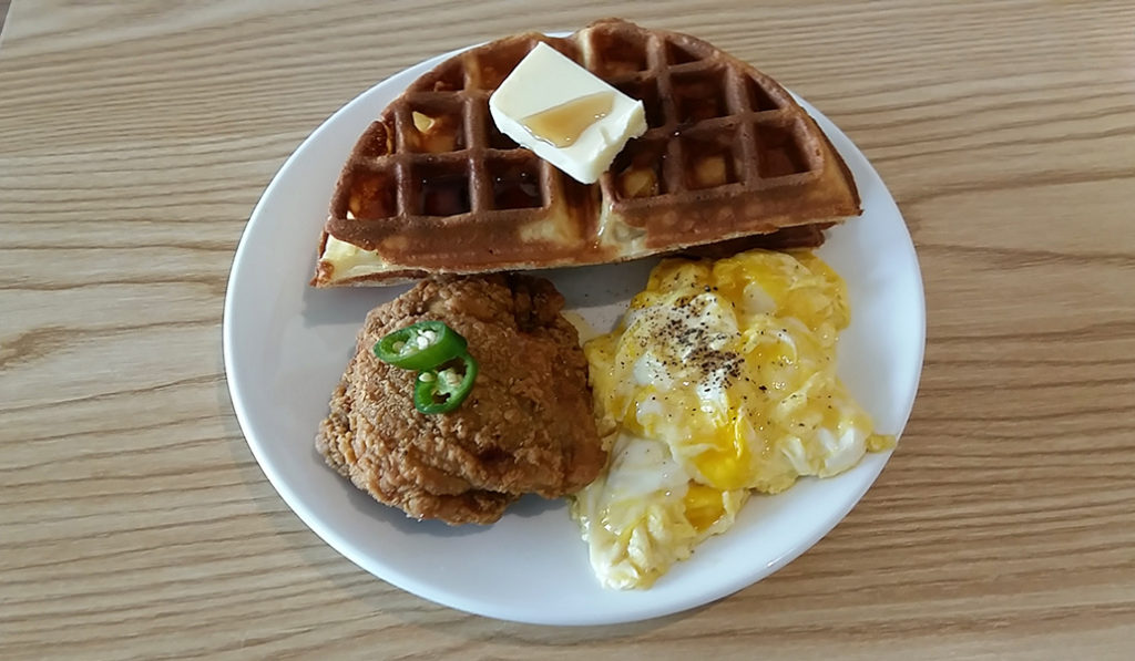 The scrambled eggs were decent, at least, but not as smooth or creamy as I think a dish like this requires—they needed to be softer and moister to offset the dryness of the waffle.