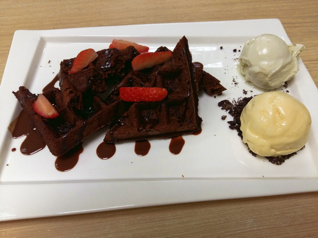 There are two types of waffles served here now: the Brownie waffle and the French Vanilla waffle. The latter is made from a yogurt-based batter, which I wasn’t feeling inclined to try this time, so I went with the Brownie waffle instead. I was told the bake-time was at least ten minutes, so I ordered a coffee in the meantime.